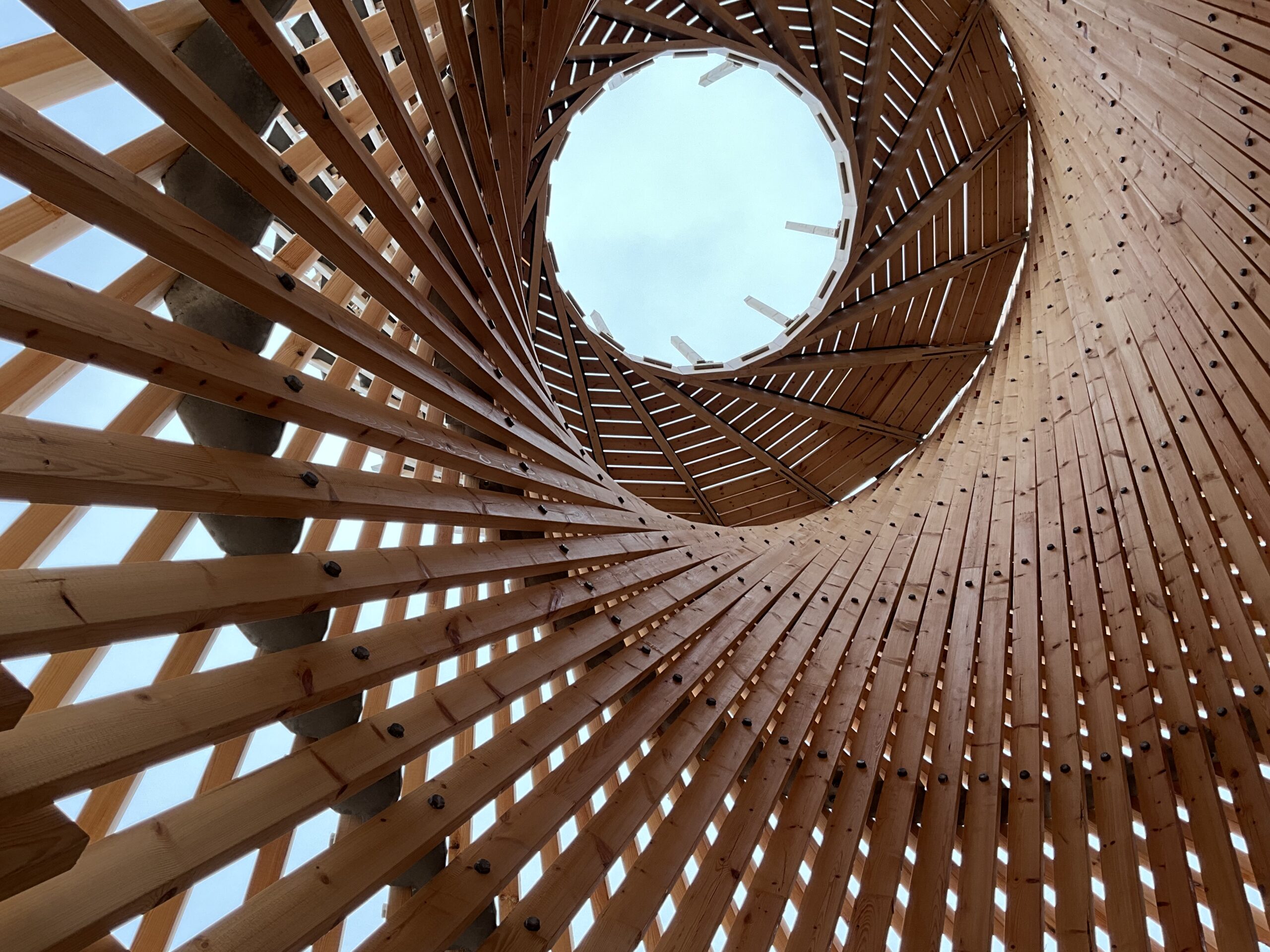 En spiraltrappa leder upp till övre planet som har utsikt åt alla håll. På toppen finns ett ståbord och sittbänk som sträcker sig runt hela utsiktsplatsen.