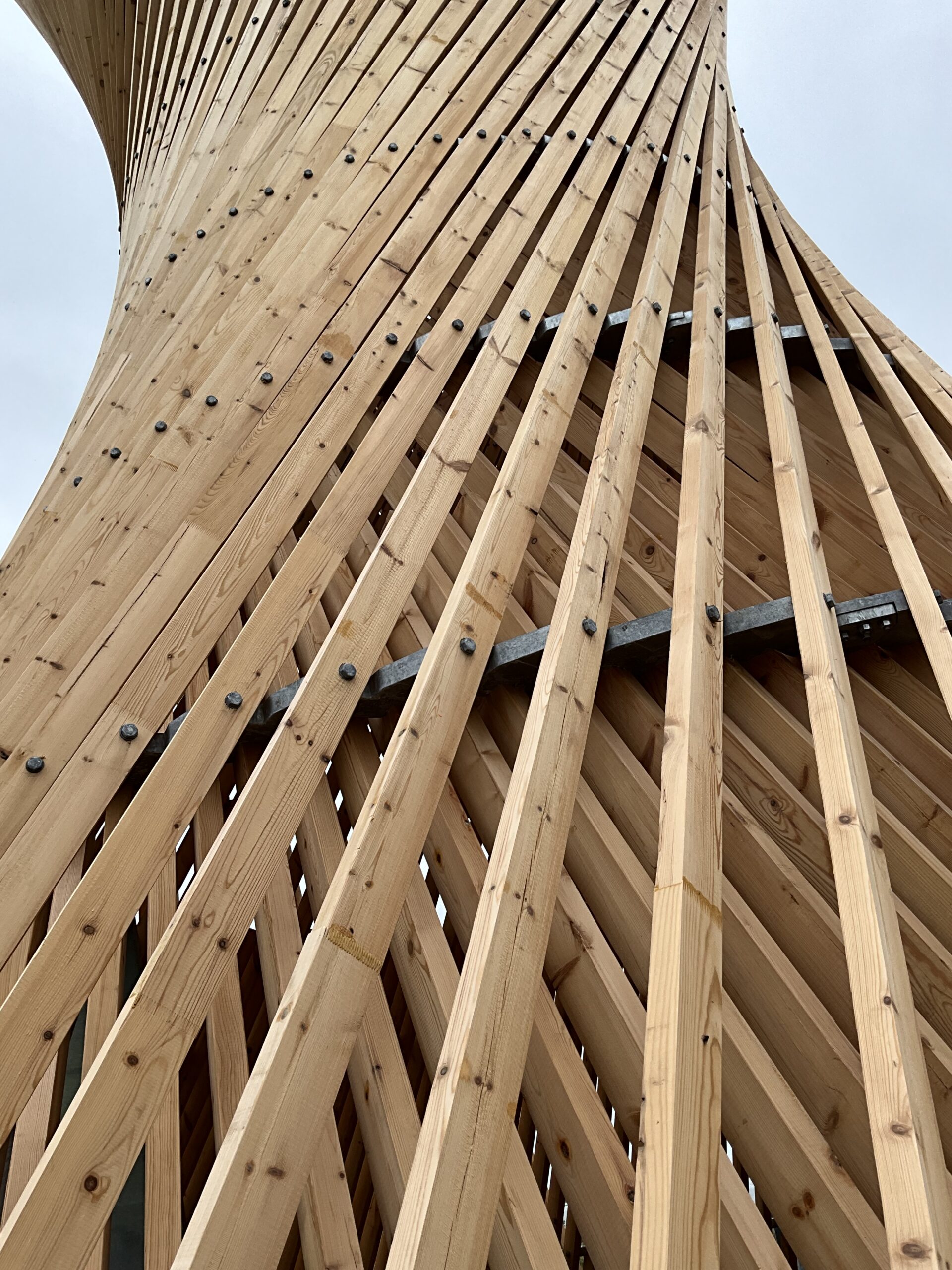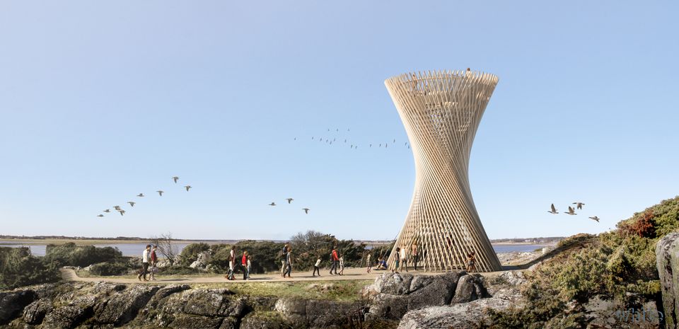 Nybyggnation av utsiktstornet Kärven på Lassaberget, norr om Getteröns Naturum, Varberg. Det timglasformade utsiktstornet helt i trä består av 13 meter långa reglar som fogas samman i en tät flätstruktur.